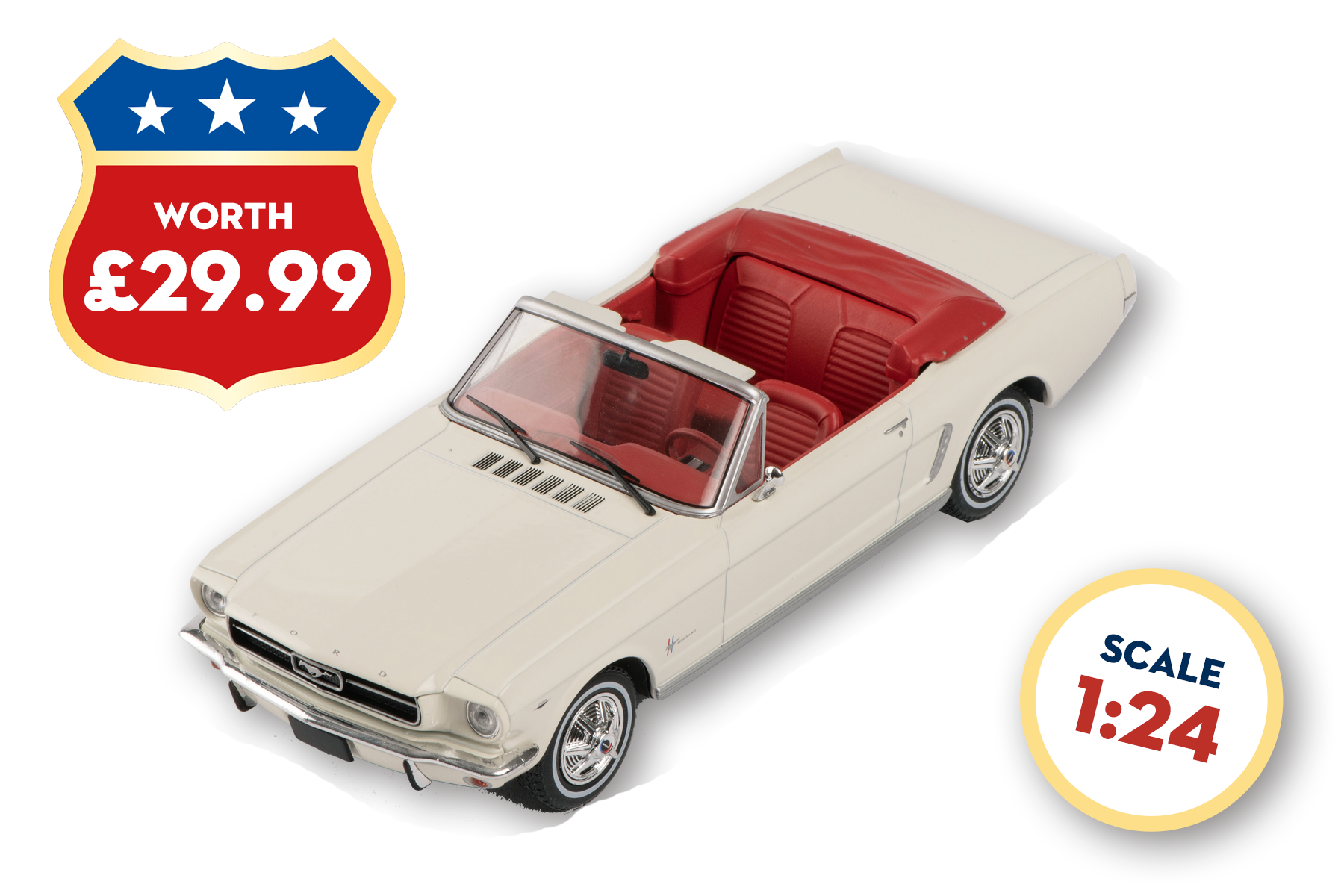 In its deluxe version with two-tone seat upholstery, the best selling Mustang continued to appear in exciting new versions with changes to the engine and the look. The Mustang represents a true milestone in the history of cars. Model is in 1:43 scale.