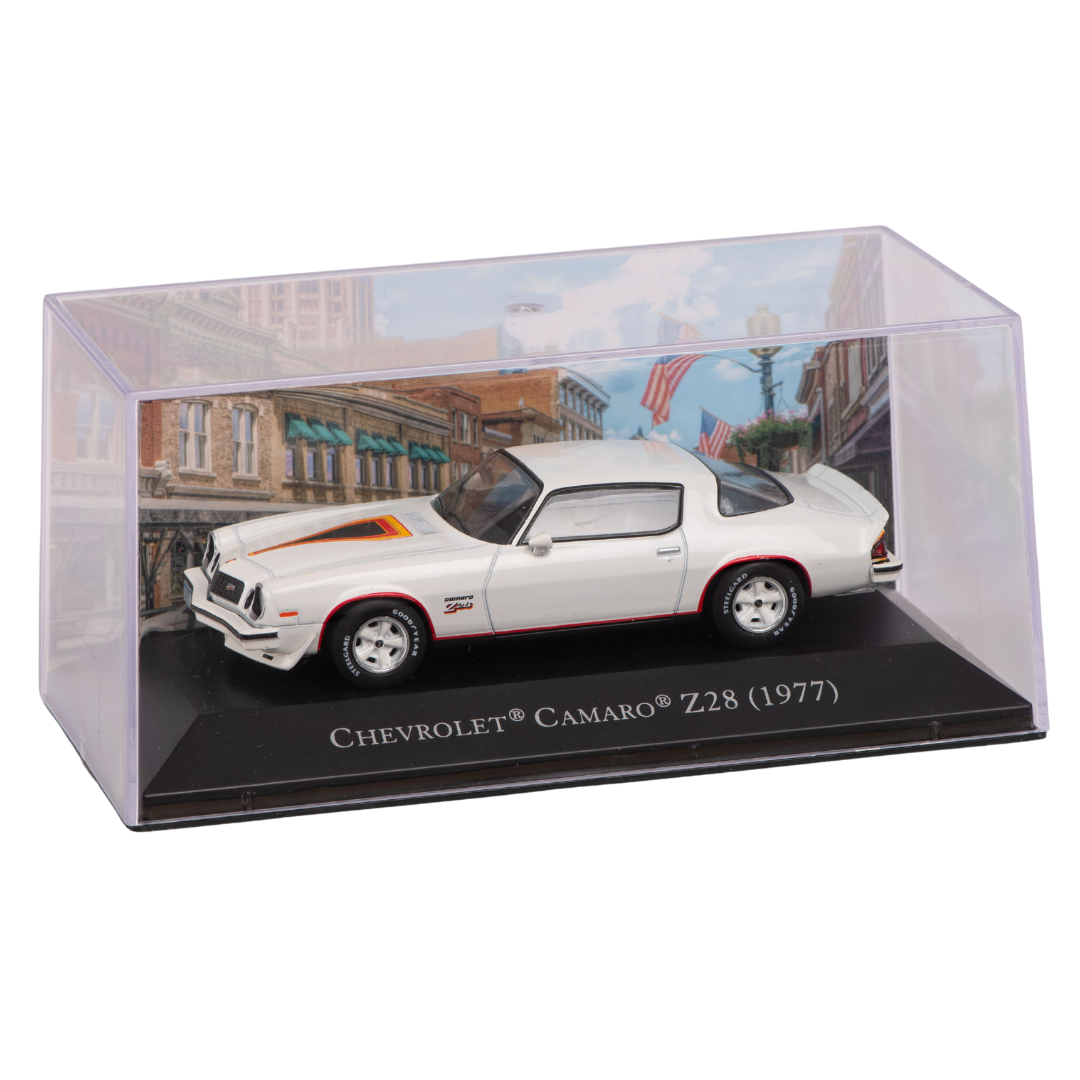 The ’77 Camaro sported a new front end design (egg-crate style grille and rectangular turn signals), plus was visually updated with bold graphics and striping unique to the Z28, a new air induction hood scoop and colour-keyed sport mirrors.